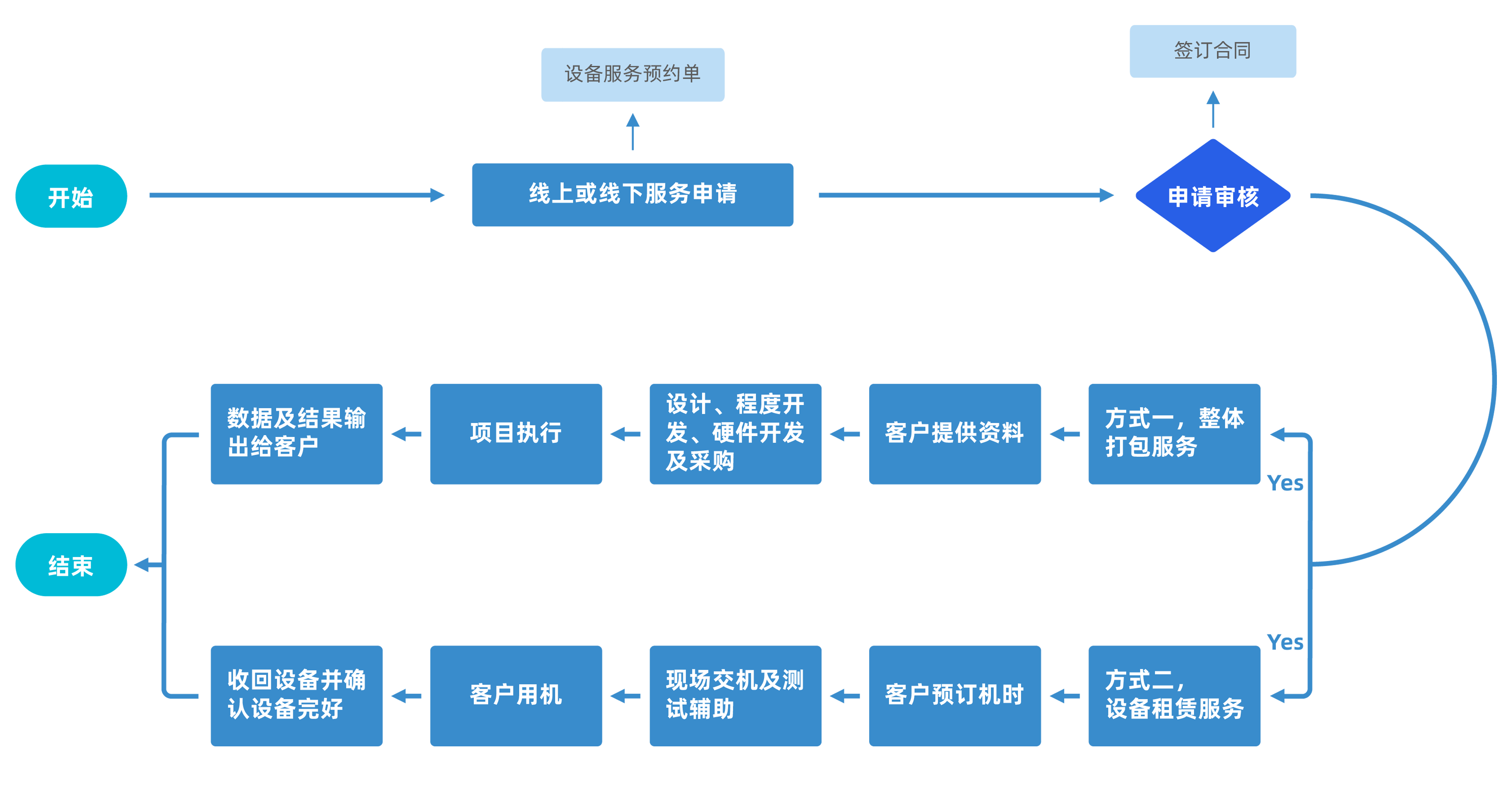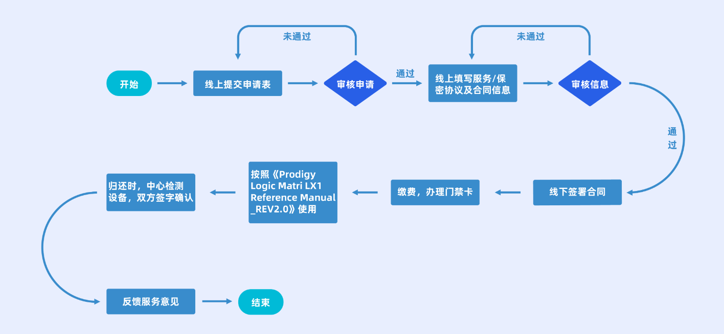 1)测试申请:用户与测试中心工作人员就工程方案等达成一致并签订服务合同;