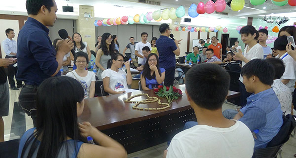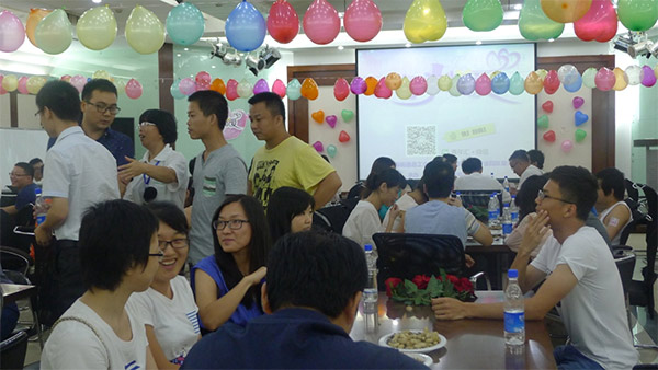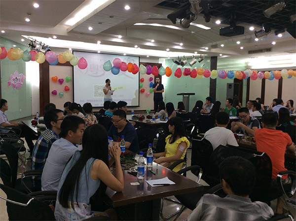 | 活动开场,大家愉快的交流。活动现场氛围轻松且活跃。 活动环节一:活动嘉宾男女分组(6—7人为一组)并选出各组组长,按各组对爱情和婚姻的理解,利用桌上现有物品摆放出不同形态来阐释什么是爱情和婚姻。此环节中,大家更加放松,也对彼此有了进一步的了解。每个嘉宾都敞开心扉的与他人交流甚欢。 活动进行到中场,现场男嘉宾在情感指导专家--胡清老师的安排下进行座位调换,给予每个嘉宾充分的接触机会,与不同异性之间相互认识交流。 活动环节二:经过一轮小组交流,主持人邀请各小组队长上台做“特别推荐”,向各位嘉宾介绍本组优秀的男女嘉宾,让在场的人能够更深层次的了解,现场氛围热烈而欢快。 在活动的最后,四位男士在全场的鼓励和见证下,向他们心仪的女士成功表白,并获得了由主办方提供的电影票礼物。伴随着甜蜜温馨的音乐声,此次活动在欢声笑语中圆满落下了帷幕。 2014年8月30日晚,“粤享悦爱”寻TA 交友活动在高新区文体中心三楼多功能厅举行。本次活动由粤海街道总工会、深圳高新区服务中心主办,高新青年汇青年俱乐部承办,来自粤海片区的76名单身男女(男39人,女37人)成为了此次活动的主角。活动现场多次高潮迭起,掌声不断、交流谈笑之声此起彼伏。